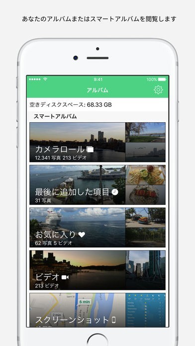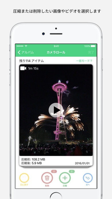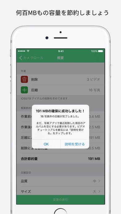 - 削除されたファイルは、写真アプリの「最近削除した」アルバムに格納されます。ディスクスペースを完全にクリアにするには、そちらから写真を削除する必要があります(その方法については、本アプリ内に説明ビデオをご用意しました)。