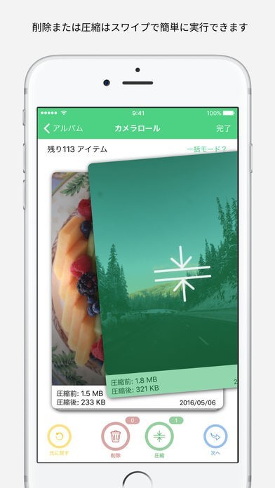 アルバムを確認して左右にスワイプするだけで、圧縮または削除する写真やビデオを選択することができます。また、サイズを変更したい画像をスワイプするだけで、携帯電話の空き容量を確保できます。