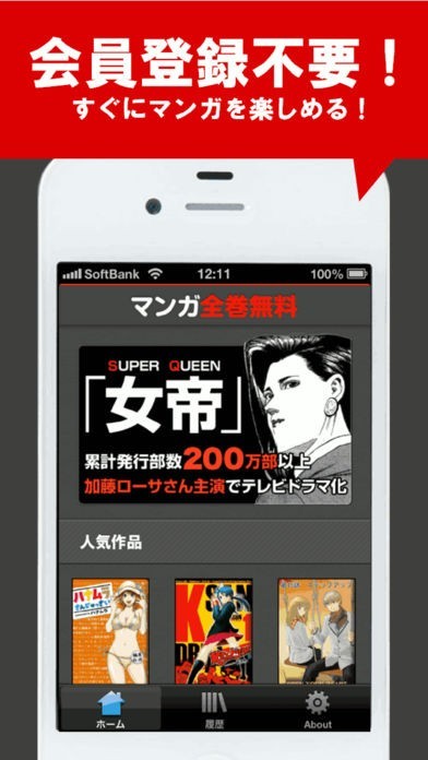 120万ダウンロードを記録した『女帝』などの人気漫画が全巻無料で読める漫画アプリです。 会員登録などの面倒な作業は一切不要で、漫画をダウンロードすればいつでも漫画をアプリ上で読むことができます。 『ハイスクール奇面組』といった昔懐かしい漫画などがライナップされています。 移動中でも気軽に漫画を読みたい人向けのアプリです。