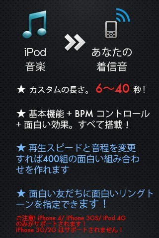 ☆ あなたのiPodの曲で着信音を作りましょう!普通の着信音だけではなく、面白くてユニークなものも作れます。