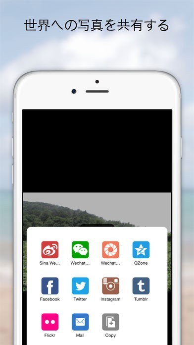 アプリには写真の共有システムが付いています。SNSなど、数多くのシェア先を選択できます。