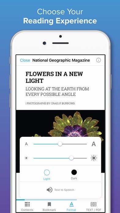 「Zinio」は、文字の大きさ、明るさを調整でき、自分の読みやすいモードに変えることが出来ます。雑誌が読みたくても文字が小さくて読めないお年寄りにも優しい作りになっております。