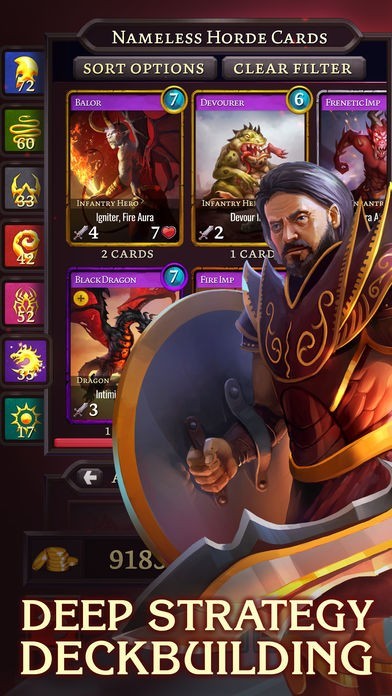 With over 250 unique cards to place in your deck (each with their own stats and special abilities), 24 powerful heroes, and no deck building limits, the strategic possibilities are endless! The immense variety of heroes, cards, equipment slots, and other features provide a depth of strategic options unparalleled in other CCGs and TCGs.
