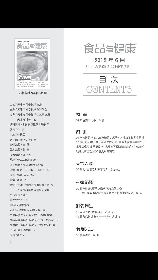 App Storeより引用《食品与健康》杂志是一本倡导人们提高生活质量的科普期刊。设有饮食文化栏目“天地人谈”、讨论健康热点问题的“健康互动”以及由专家撰稿指导科学饮食的“饮食科学”栏目。另外,“美食地图”将带您畅游天下,遍尝美食。想要亲自下厨大展身手的您,也可以从“八方食单”和“私房煮意”中找到精辟实用的家常菜谱。有了健康方面的问题,还可以与我们的医学专家“健康面对面”,让《食品与健康》杂志,成为您的“私人医生”。