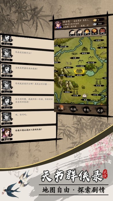 《天书群侠录》采用大地图入场模式,探索名门大派,寻访名侠与枭雄,找寻失落的十四本天书,成为武林盟主,一统江湖.