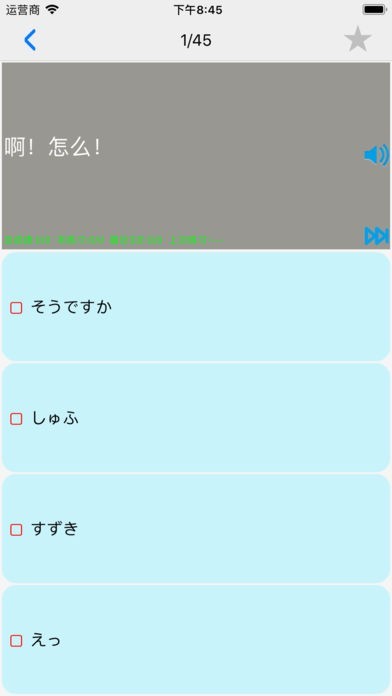 4.收藏功能:在单词和文法模块中,APP提供了收藏模式,和以往的一组收藏相比,新的收藏模式可分为7组。方便您进行不同的分类。同时,收藏可配合语音复读,练习等模块,让您的效率可以事半功倍。