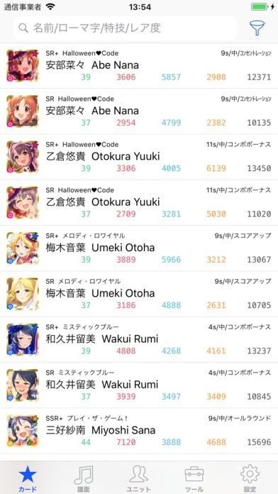 さまざまなアイドルを使って模擬ユニットを編成することが可能となっているほか、ライブスコアの計算をすることができるようになっているので、事前シミュレーションが可能です。
