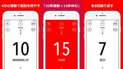 たとえ短時間の運動でも、運動時間と休憩時間を適切に管理すれば、長時間トレーニングと変わらない脂肪燃焼効果を期待できます。このアプリで時間を設定すれば、ごく自然に効率的なトレーニングをすることができます。