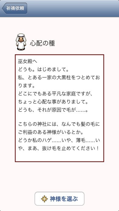 ゲームを進めていくと神様目当ての参拝客から、神様に祈祷依頼が届きます。巫女になったつもりで参拝客の願いを叶えてくれる神様を召喚して、参拝客の願い事を叶えて喜ばせてあげましょう。