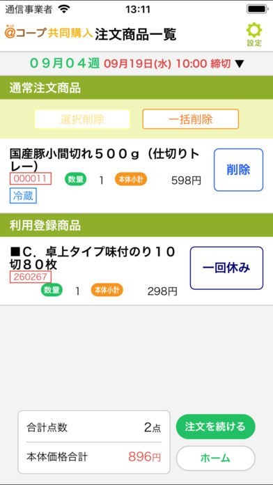 締切日時も一目で分かるようになっており、注文した商品の一覧と数量、合計金額がすぐに分かるので紙に記入するよりも圧倒的に便利です。取り消したい時には削除ボタンがあるので、簡単です。