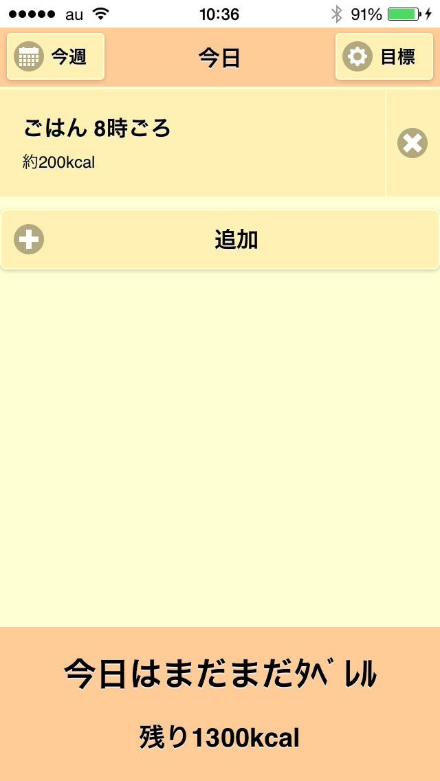 - 最初の画面は本日の食べた量を表示する場所です。"追加"ボタンで食べた量を入力する画面へ移動できます。