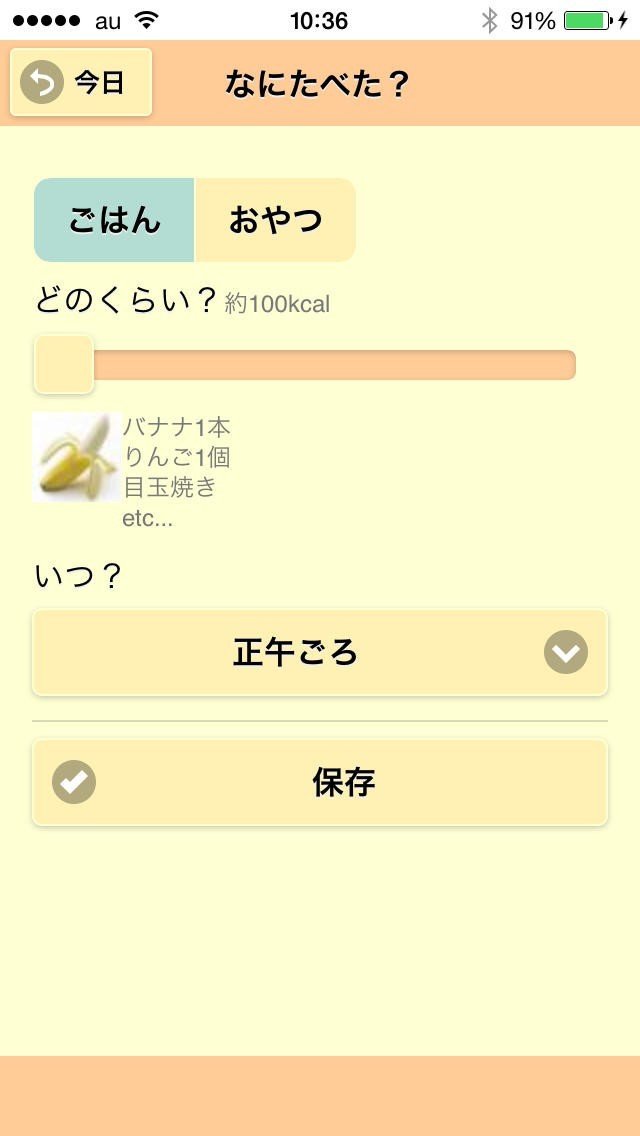 - 食べた量を入力する画面では、入力項目は2つのみです。どのくらい食べたか、いつ食べたかをおおよその値で入力するのみです。