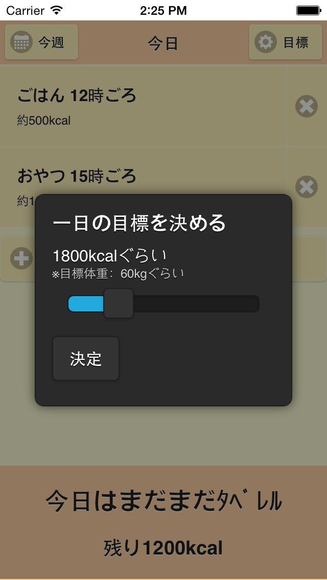- 右上の"目標"ボタンから一日の目安カロリーを変更できます。
