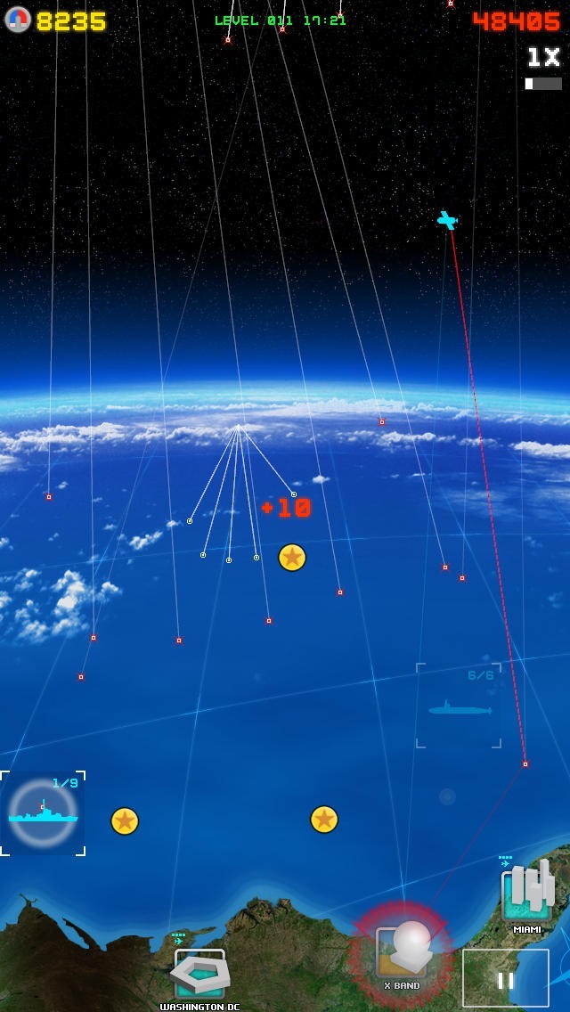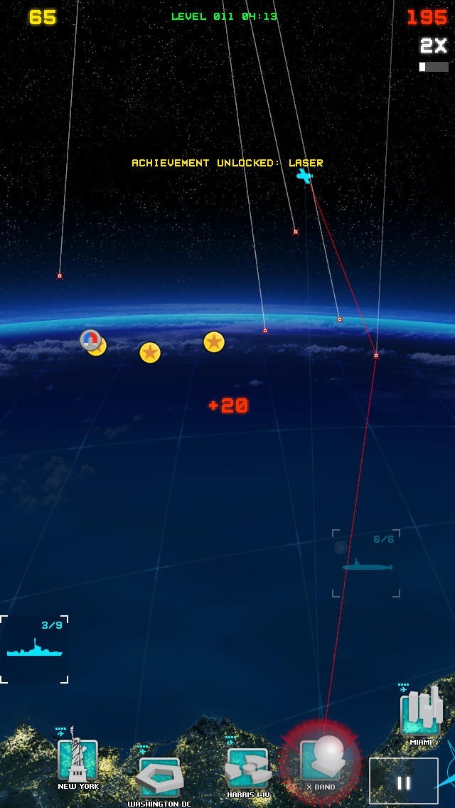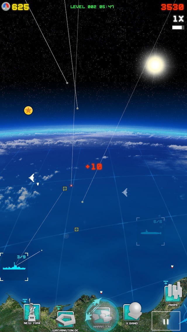 Enemies are attacking your cities! As the commander, it is your responsibility to defend them. A variety of enemy weapons and planes will be incoming trying to destroy the five cities at the bottom of the screen. You need to fire missiles to destroy the incoming weapons. If anything gets through, one of your cities could be destroyed. When all of the cities are gone, the game is over. On each level you have ships and submarines charged with a limited amount of ammo, so make sure most (if not all) of your shots are accurate or you could temporarily run out of ammo and leave your cities at risk! As the levels progress, there are more and more enemy weapons to destroy which come in at an increasingly faster rate.