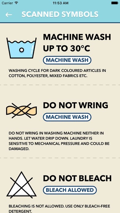 In case of bad light conditions you can manually choose symbols from the list. Lot of tips regarding washing, bleaching, drying, ironing and professional care are included. There is a really detailed description how to wash your laundry and how to wash some kind of fabrics.