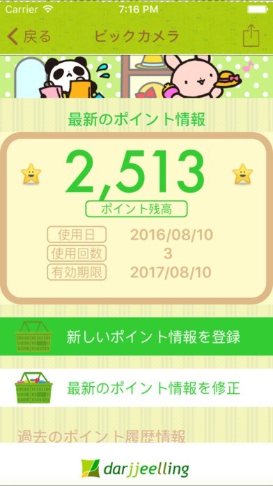 せっかくこつこつ貯めたポイントがいつの間にか消えてしまった!?という経験ありませんか? 「ポイント残高」はいろんなポイントカードのポイントを自分の手で記録するから忘れません!ポイントをしっかり管理でお得にお買いもの。家計も大助かり間違いなし。 期限切れでポイント消滅‥。というショックからあなたを救ってくれます。 使い方は簡単です。 ・カードを写真で撮って登録 ・期限が近いカードやしばらく使っていないカードは「使い切るぞ!リスト」に登録で要チェック ・今のポイント残高をツイートでやる気アップ パンダやうさぎなどかわいい動物にも癒されます。