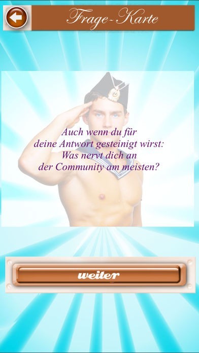 「Gay-Spiel」で遊べるのは簡単な質問ゲームです。ゲイならドキッとするような質問がランダムで出されるので、それにプレイヤーが答えるというものです。できない方はいませんから初めて話す相手とも問題なく楽しめます。