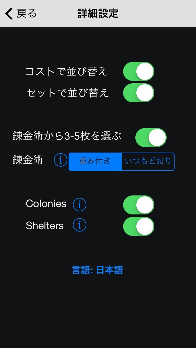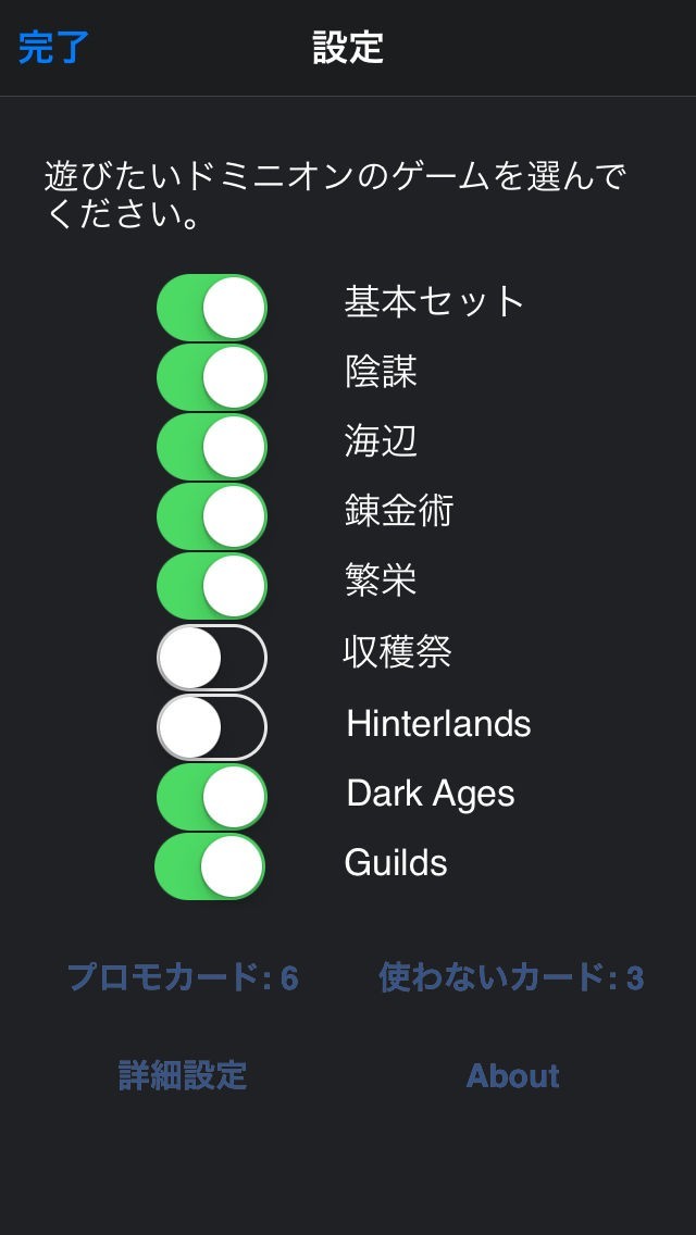 大人気カードゲームのドミニオンでは、膨大な種類のカードから実際にゲーム時にサプライとして使用する10枚を選出する必要があります。このアプリでは、使用シリーズにチェックを入れるだけでランダムでサプライを決定してくれます。