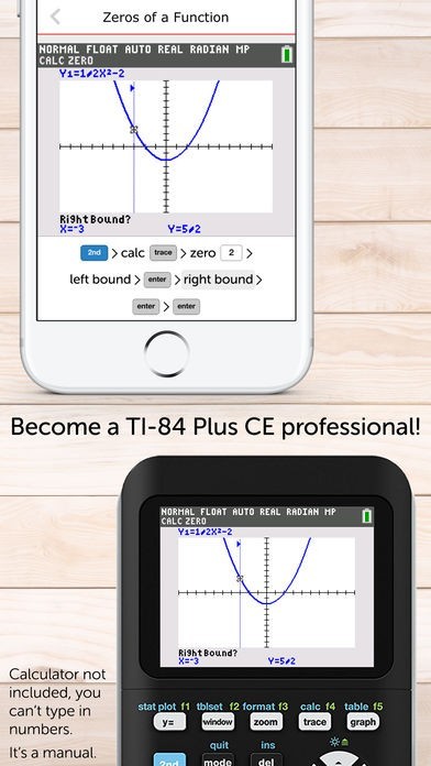 • You can swipe through screenshots of the original graphing calculator which show every steps you have to do (220 screenshots in total) or watch small animations to see how it works on the TI-84 CE!