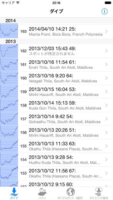 ダイビングのスポットをGPSで記録して、スポットで何回もぐったかという情報も記録することができます。また、スポットに関する、気温などその他の情報もこのアプリで取得することができます。