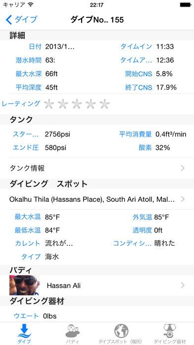 このアプリでは、ダイブに関する全ての情報を記録することができます。平均の深さはもちろん、最深部の深さやタンクの残り酸素の腹具合まで管理することができるのでプロでも使えます。