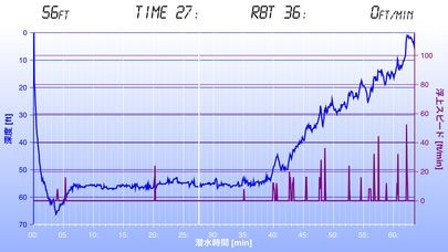 あとから、どんなダイビングだったのかということを見るためにこのアプリはグラフで見やすく表示してくれます。ダイビング時間を横軸に、縦軸に温度と深さをとったグラフを毎回作成できます。