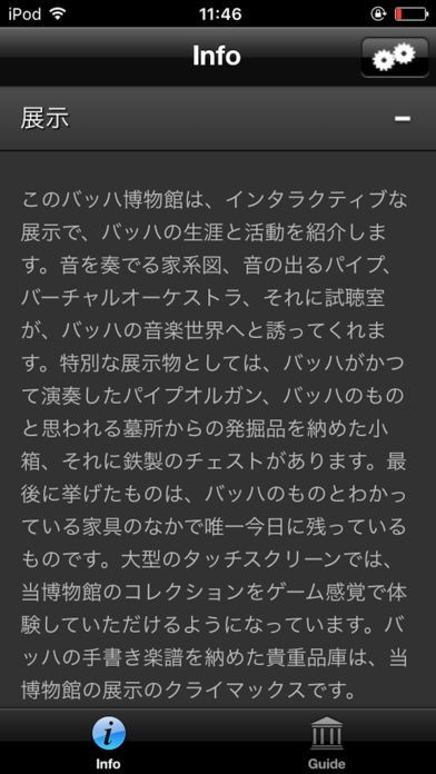 App Storeより引用このアプリケーションにはライプチヒバッハ博物館のオーディオガイドと展示場のインフォメーションがすべて含まれています。