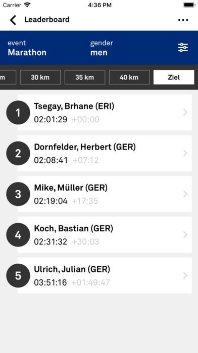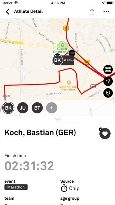 With "Track My Favorites" the Mainova Frankfurt Marathon Tracking & Event App offers the option to create an individual list of favorites for fans, family and friends along the race course or at home. Current split times and positions are being displayed (depending on availability).