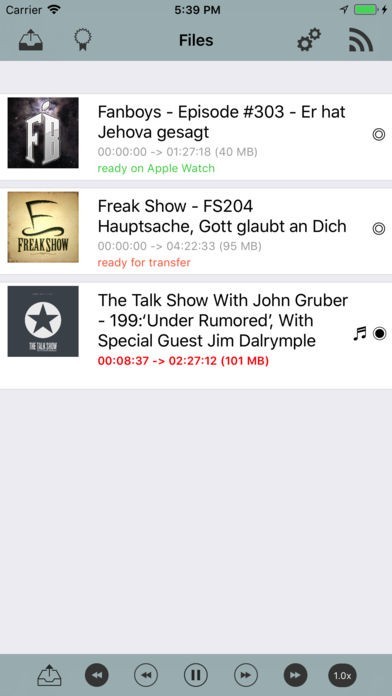使い方はいたってシンプルで、番組を選んで登録作業を行い、番組の中からAppleWatchに同期したいエピソードを選択するとダウンロードが開始されます。ダウンロードが完了したら、AppleWatchアプリを起動してWatch Playerの左上の転送マークをタップするだけで簡単に同期が完了します。
