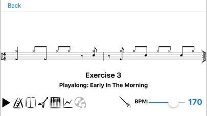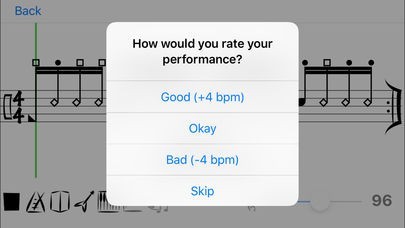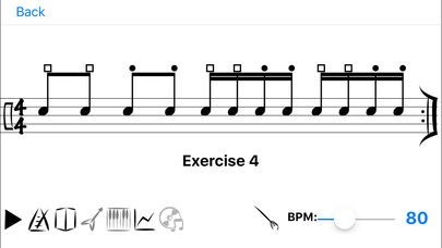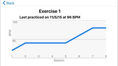 - Practice mode with configurable settings of exercise sets, repetitions, automatic tempo increase and breaks in between sets