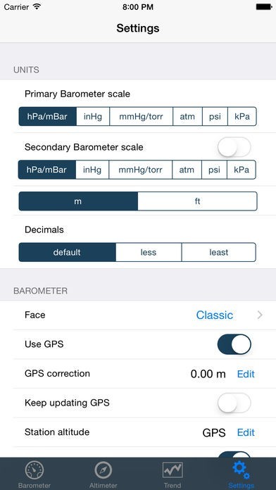 Barometer & Altimeterでは高度はメートルとフィート表記、気圧はヘクトパスカルを始め8つの単位から選べるため、海外での使用もスムーズに行なえます。