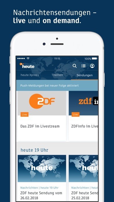 Im Bereich „Sendungen“ finden Sie die ZDF-Livestreams und die aktuellen Ausgaben der ZDF-Nachrichtensendungen heute Xpress, heute 19 Uhr, heute journal und heute+. Außerdem sehen Sie hier Informationsmagazine wie Berlin direkt, das auslandsjournal und das Mittagsmagazin. Auch die aktuellen Ausgaben von Maybrit Illner und Dokumentationen aus der Reihe ZDFzoom und ZDFzeit sind abrufbar und abonnierbar. Wenn Sie Sendungen abonnieren bekommen Sie eine Benachrichtigung, sobald eine neue Ausgabe der gewählten Sendung in der App verfügbar ist.