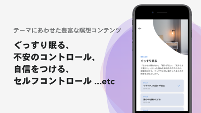 瞑想/マインドフルネスについて学べるだけでなく、寝る前、朝起きたとき、落ち込んでいるとき、イライラしているとき、人間関係で困っているときなど、様々な目的・場面に合わせた瞑想コンテンツを多数ご用意しています。