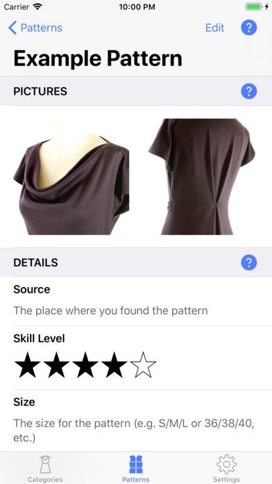 The app lets you gain the perfect overview in a single place, whether your patterns are purchased, found in magazines, or your own creations entirely. You can categorize your patterns based from standard garment types, or create as many of your own categories as you like. You can have your patterns sorted alphabetically, by most recent usage, or in any particular order you like. Each pattern can be associated with as many categories as you wish.