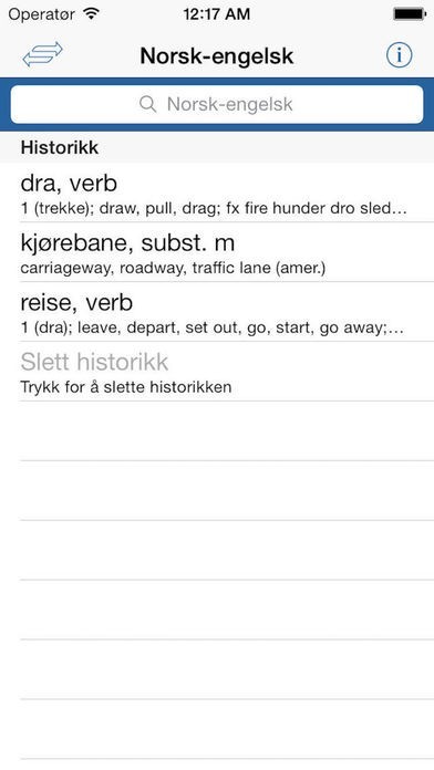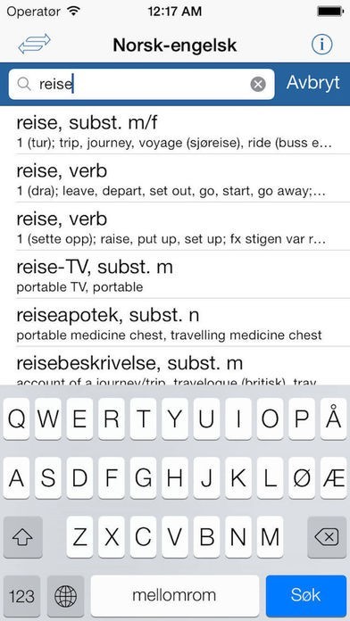 The dictionary is indisputably the largest and most advanced offline dictionary to and from English for iPhone, iPad and iPod Touch in the Norwegian market. The Norwegian-English dictionary contains more than 95,000 headwords and phrases and 204,000 translations. The English-Norwegian dictionary contains 124,000 headwords and phrases and 320,000 translations. It contains British English as well as American English.