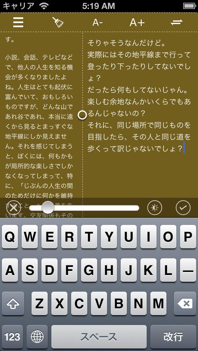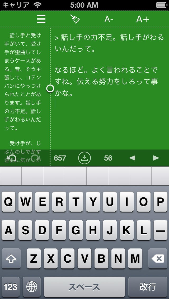 App Storeより引用Re: writer(リライター)は二つのテキストビューを持つメモアプリです。メールの返信文作成や原稿の書き直しに適しています。