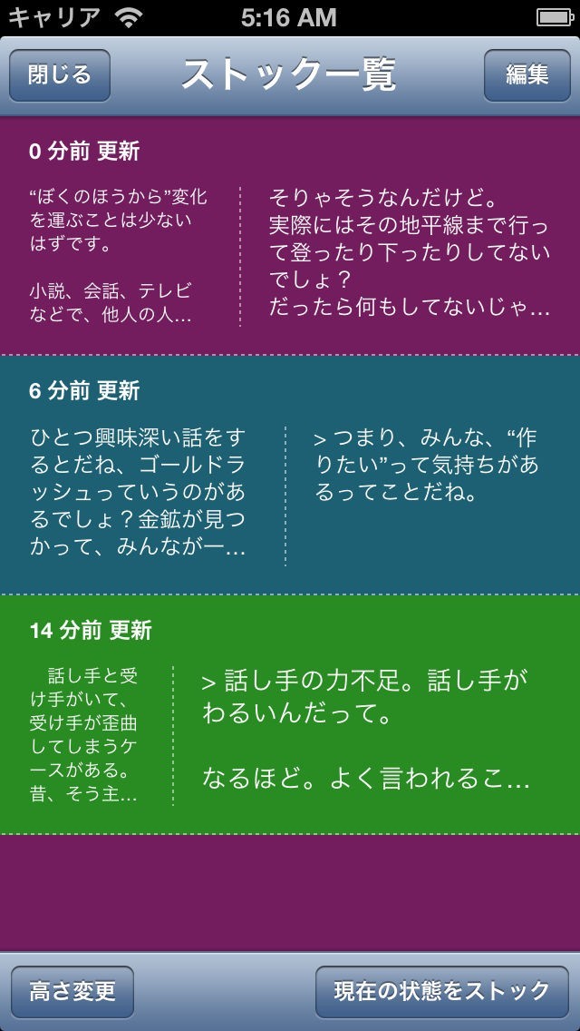 ・Re: writerは、左右のテキスト、背景色、フォントサイズ、リサイズした横幅のバランス等の現在の状態のコピーを「ストック」として保存します。