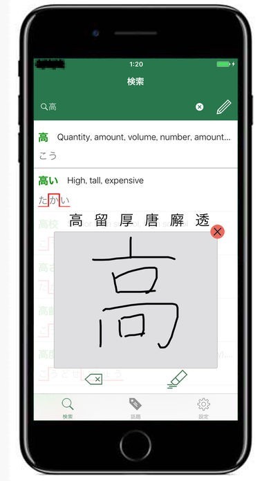 手書き機能は、携帯の画面上に漢字を書くとそれに近い感じが検索され表示されます。幹事をタッチすると発音や意味が表示され、とても便利です。どう読むのか知りたい感じがあれば手書き機能を使って即探すことができ便利です。