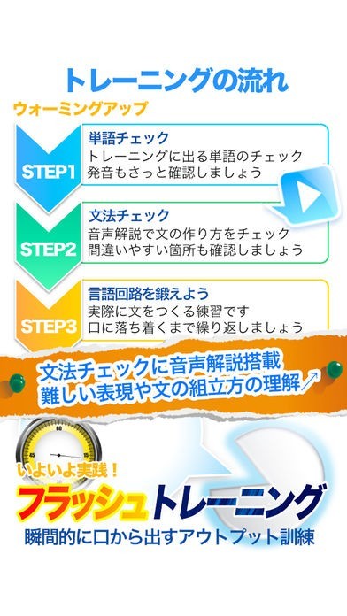 中国語の基本フレーズをフラッシュトレーニングにより徹底的に刷り込みます。基礎単語・文法を学びつつ、視覚と聴覚を刺激して、条件反射的にフレーズが口から出るようになります。