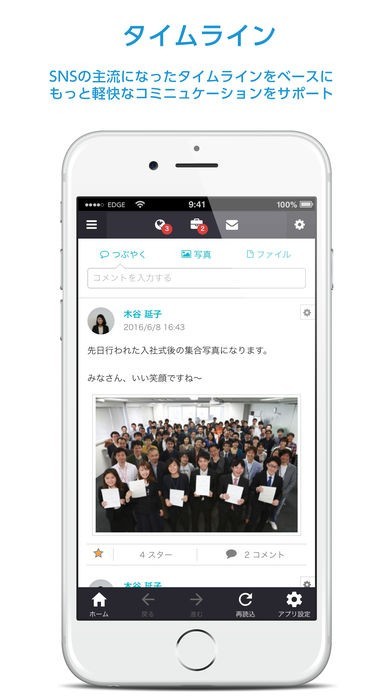 同僚や上司とのコミュニケーションをスムーズにしてくれる社内SNSアプリです。タイムライン機能を搭載しており、同僚が投稿したテキストや上司が投稿した写真を、まとめて閲覧することができます。