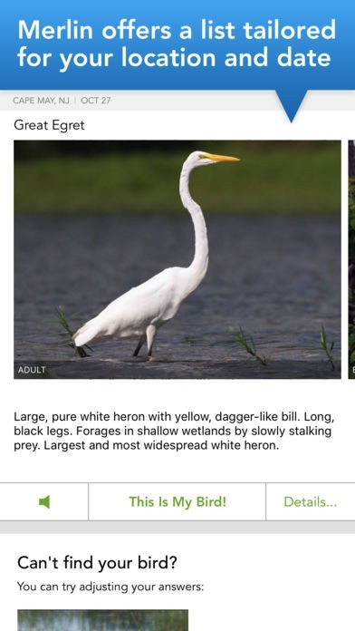 • Intelligent results. No more scanning through hundreds of possibilities! Merlin shows the birds near you that fit your description.