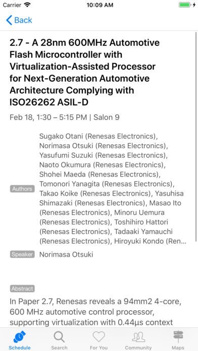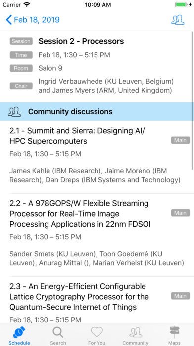 App Storeより引用Welcome to the official app for the 2019 International Solid-State Circuits Conference (ISSCC). The ISSCC app is designed to serve your needs by providing you the information whenever you need it. It is designed to be easy to use, convenient, and fast. It has no social networking features built in, and won't compromise your privacy.