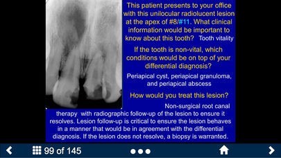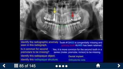 App Storeより引用The SecondLook™ Oral Radiology application will help learners of the dental sciences to self-test their level of knowledge and ability to recognize technical errors, anatomical structures, dental disease, and maxillofacial pathology in intraoral and panoramic radiographs as well as CBCT scans. This app covers the following topics: Radiographic Anatomy (on Periapical & Bitewing Radiographs); Radiographic Anatomy (on Panoramic Radiographs); Image Quality and Common Errors; Radiographic Interpretation; Radiographic Anomalies; Buccal Object Rule (BOR); Cone Beam Computed Tomography (CBCT); Pediatric Radiology; and Presentations of Oral Pathologies (including inflammatory lesions, cyst and cyst- like lesions, benign tumors of the jaws, malignant diseases, bone and systemic diseases).