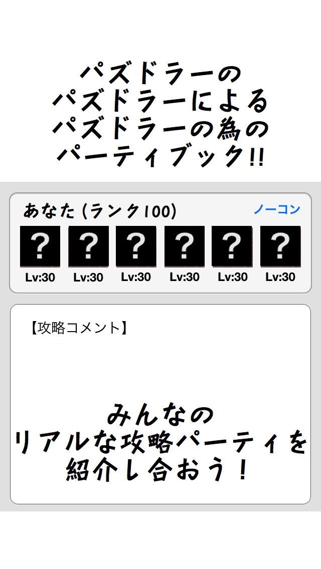 人気パズルゲームアプリのパズドラで、ほかの人がどんなパーティーを使ってダンジョンをクリアしたのかって気になりませんか?「究極!!ノーコンパーティ〜テンプレート紹介〜 forパズドラ」では、ノーマルだけでなく、スペシャルやテクニカルダンジョンも含めたダンジョン攻略パーティーの紹介をするアプリになっています!自分のパーティーをこのアプリで自慢するのもよし!これからダンジョンを攻略するのにほかの人のパーティーを参考にするのにも便利です!