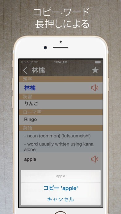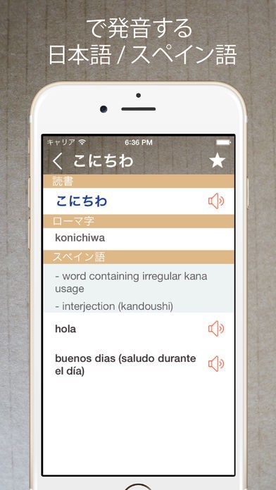 単語を検索し、ボイスボタンを押すだけでネイティブの発音を聞くことができます。日本語・スペイン語両方の発音を聞くことができるので、どちらの語学を楽手している方も使えます。