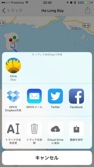 - GPXファイルとしてエクスポート (iTunes シェアリング、Dropbox、メール、ブラウザ)