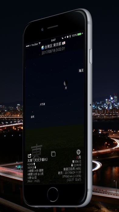 位置だけではなく、月食または日食などの珍しい惑星の現象も反映されているので、どのように観測できるかをシミュレーションできます。また半月など月齢も知ることができ、空の視覚的情報を把握できます。