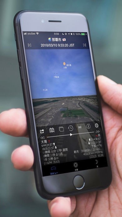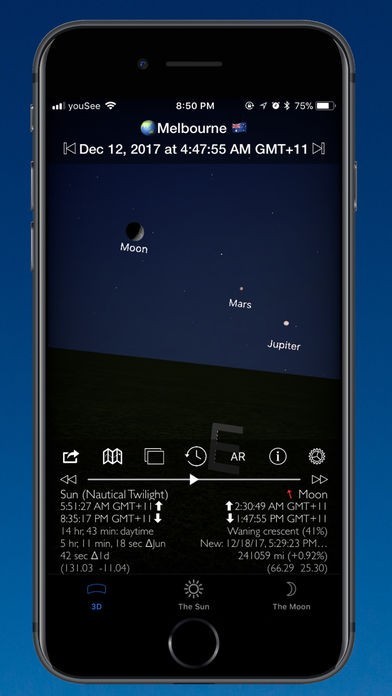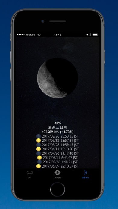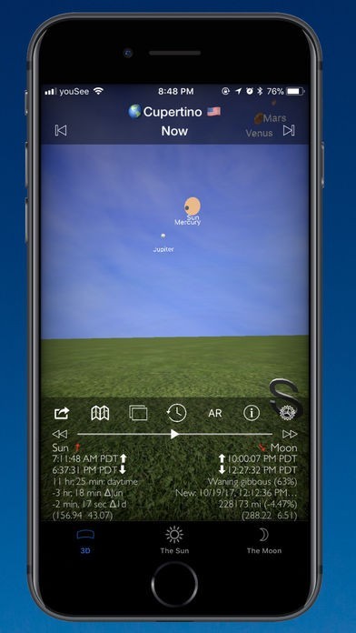 空のビューをスワイプすれば日時が変更されて選択された日付の太陽と月や月面や次の新月や満月の位置が表示されるようにできて任意の日の太陽な月の状態を確認できて便利です。