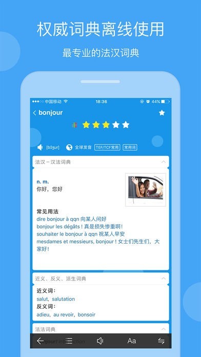 - 准确音标,同时内置真人法语发音、全球各地法语发音让你了解每个单词的读法