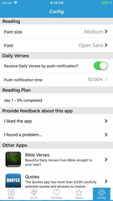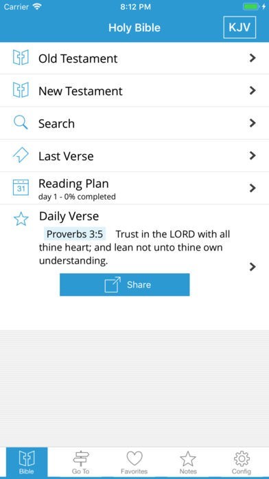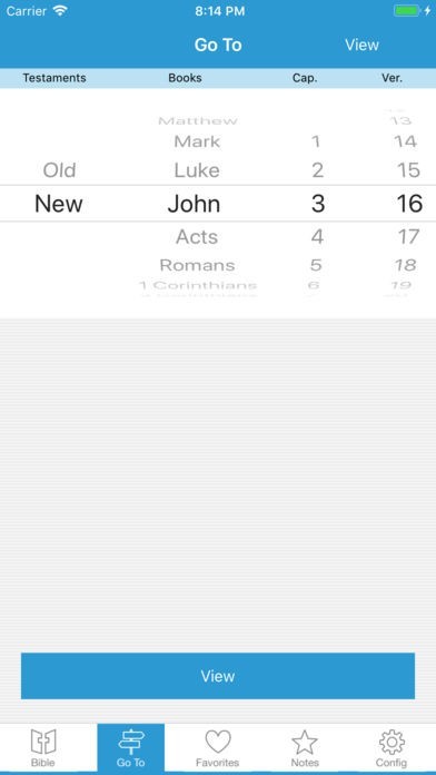 This app allows you to browse the books, chapters and verses from the Bible. Using the 'Go To' screen, you will find in seconds the Bible verse you want to read.